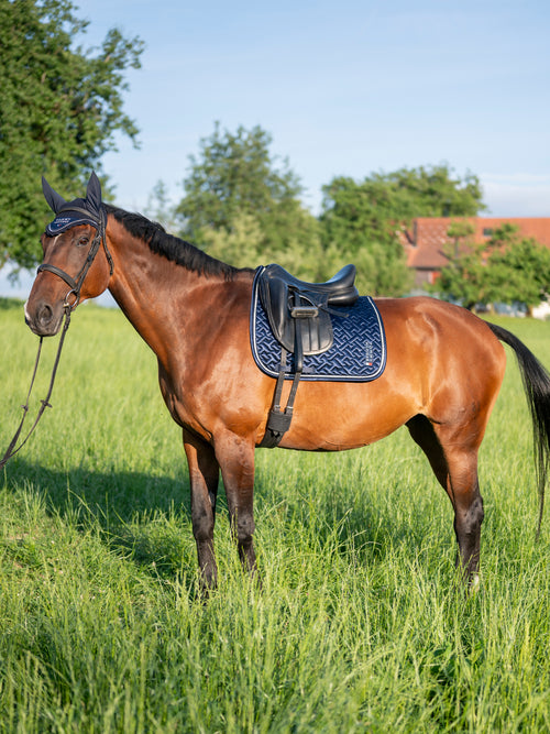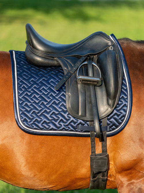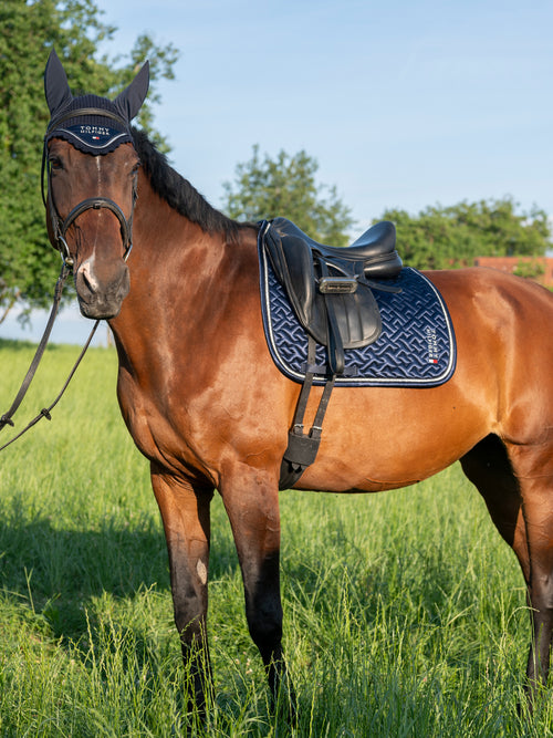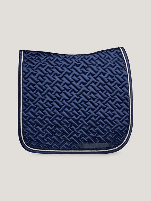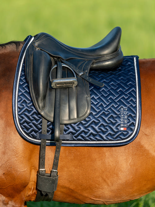 The Windsor TH quilted Dressage Saddle Pad takes on the classic saddle pad and gives it a sleek edge. Designed with a shimmering fabric finish, Tommy Hilfiger in lurex and Flag embroidery, shine cord edge detailing, and TH Monogram pattern quilting. The saddle pad features a waffle inner for extra comfort, breathable and wicking properties, is shape-retaining and well-fitting with good wither clearance.